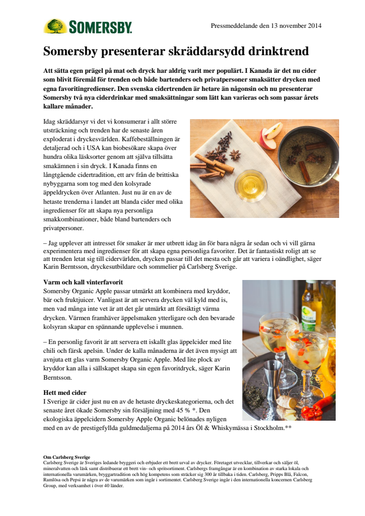 – Jag upplever att intresset för smaker är mer utbrett idag än för bara några år sedan och vi vill gärna experimentera med ingredienser för att skapa egna personliga favoriter. Det är fantastiskt roligt att se att trenden letat sig till cidervärlden, drycken passar till det mesta och går att variera i oändlighet, säger Karin Berntsson, dryckesutbildare och sommelier på Carlsberg Sverige.