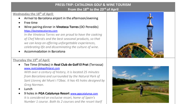 We are happy to invite Nordic journalists active in golf to join our event. The press-trip guides you through the best of Catalonia. You will get to play golf at luxury clubs and taste wines at famous vineyards. Highlights include golf at PGA Catalunya Resort and accommodation at brand-new Hotel Caddy Rooms, wine pairing dinner at award winning Vinoteca Torres. All costs covered: flights from capital airports (ARN, OSL, HEL, CPH), planned activities and accommodation as in programme. Please confirm your interest by March 27th info.act.nordic@gencat.cat