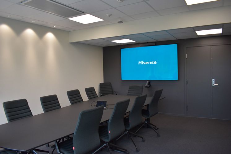 På två av kontoren har 4K interaktiva skärmar från Hisense installerats som används både som en vanlig mötesrumsskärm, men också som en digital whiteboard. Den inbyggda whiteboard-appen låter användare enkelt skriva, rita och radera information på skärmen genom beröring, antingen för hand eller med medföljande pennor. Skärmen känner igen upp till 20 samtidiga beröringar, vilket är idealiskt för samtidig användning av flera mötesdeltagare. Du kan ansluta trådlöst till skärmen via Wi-Fi-dongel, miracast och Airplay eller med en trådbunden anslutning.