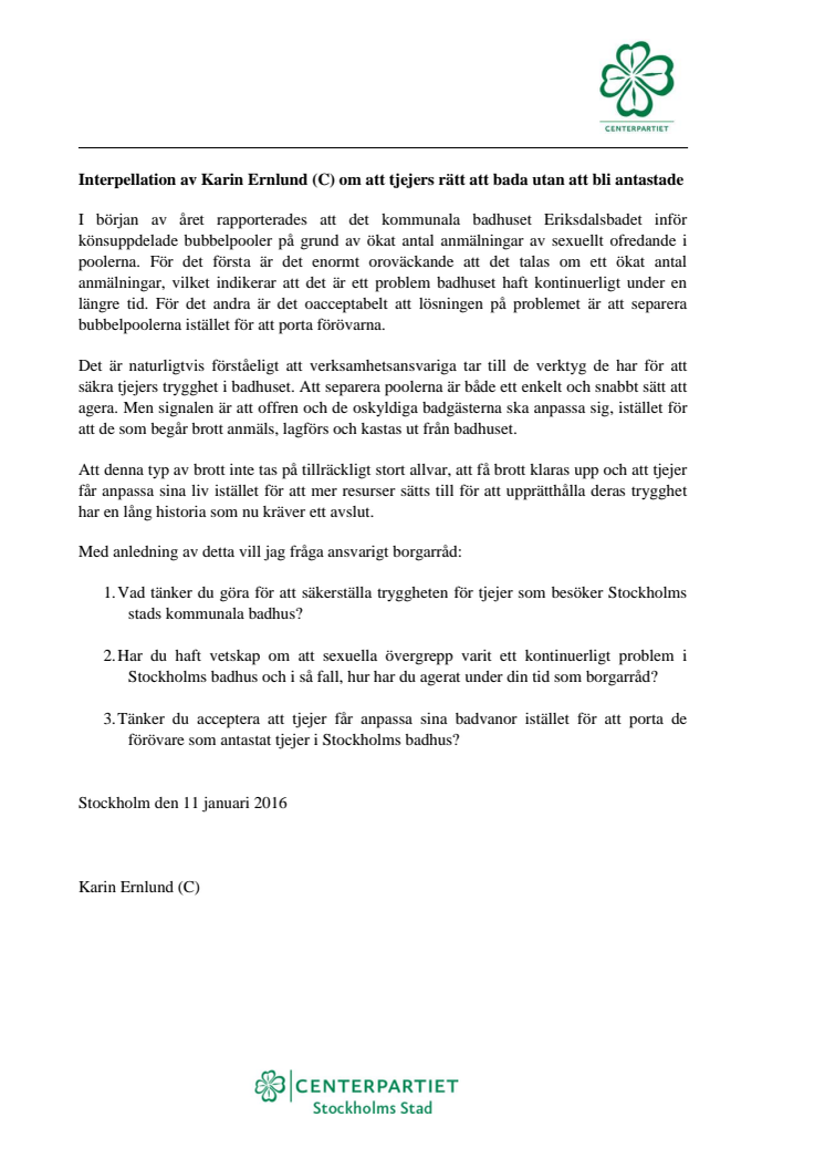 Med anledning av den senaste tidens rapporter om könsuppdelade pooler i Eriksdalsbadet och ofredandet av ett stort antal unga tjejer vid ungdomsfestivalen We are Stockholm kräver Centerpartiet svar av ansvariga borgarråd i Stockholm om vilka åtgärder som görs för att säkerställa kvinnors trygghet.