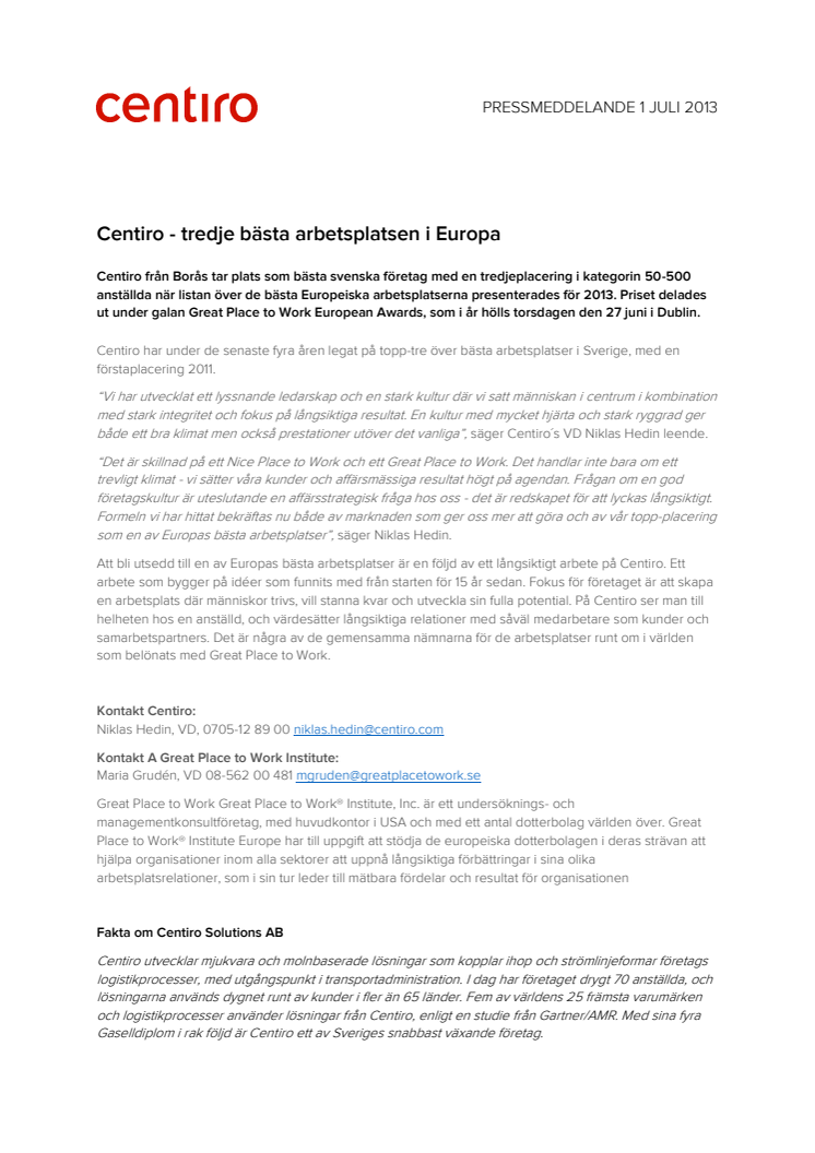 Centiro från Borås tar plats som bästa svenska företag med en tredjeplacering i kategorin 50-500 anställda när listan över de bästa Europeiska arbetsplatserna presenterades för 2013. Priset delades ut under galan Great Place to Work European Awards, som i år hölls torsdagen den 27 juni i Dublin.