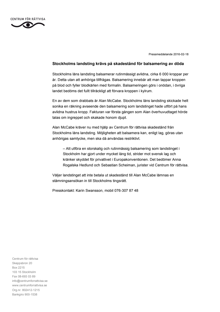 Stockholms läns landsting balsamerar rutinmässigt avlidna, cirka 6 000 kroppar per år. Detta utan att anhöriga tillfrågas. Balsameringen görs i onödan, i övriga landet bedöms det fullt tillräckligt att förvara kroppen i kylrum. En av dem som drabbats är Alan McCabe. Stockholms läns landsting skickade en räkning avseende den balsamering som landstinget hade utfört på hans avlidna hustrus kropp.
