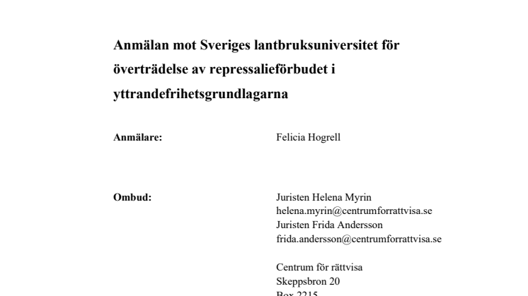 – Vår bedömning är att SLU har överträtt repressalieförbudet i grundlagen. Att JO nu får granska SLU:s ingripanden mot Felicia Hogrell är viktigt för att slå vakt om studenternas yttrandefrihet. Studenter ska inte behöva utstå repressalier från ledningen för att de uttrycker oönskade åsikter. Det är just sådana åsikter som yttrandefriheten är till för att skydda, säger Helena Myrin, jurist vid Centrum för rättvisa och ombud för Felicia Hogrell tillsammans med juristen Frida Andersson.