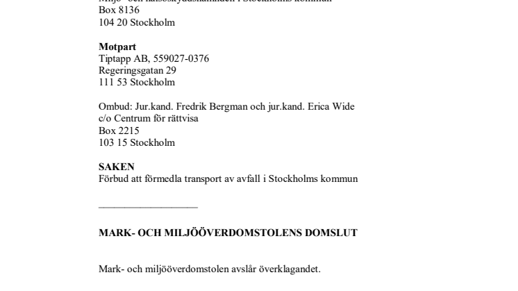 I september 2018 beslutade Stockholms stad att förbjuda delar av den populära återvinningsappen Tiptapp. Anledningen var att kommunen ansåg att renhållningslagstiftningen inte tillåter enskilda att hjälpa varandra med att köra återvinning till återvinningscentralen. Nu har Mark- och miljööverdomstolen gett Tiptapp rätt mot kommunen och slagit fast att det inte finns några hinder för en professionell aktör att skapa en digital mötesplats för hushåll att hitta varandra och erbjuda varandra tjänster i form av transport av avfall. Domen är slutlig och kan inte överklagas.