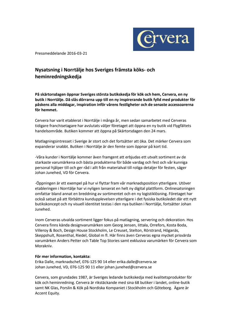 På skärtorsdagen öppnar Sveriges största butikskedja för kök och hem, Cervera, en ny butik i Norrtälje. Då slås dörrarna upp till en ny inspirerande butik fylld med produkter för påskens alla middagar, inspiration inför vårens festligheter och de senaste accessoarerna för hemmet.