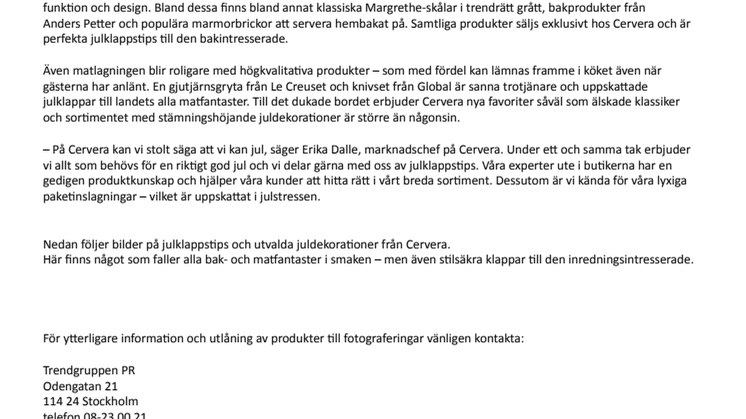 Bifogat i pressmeddelandet finns bilder på julklappstips och utvalda juldekorationer från Cervera.