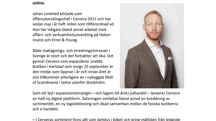 – I Cerveras sortiment finns allt som behövs i köket och kring måltiden från ledande företag som Georg Jensen, Orrefors, Kosta Boda, Le Creuset, Rörstrand och Riedel – för att bara nämna några – samt från våra egna varumärken Table Top Stories och Anders Petter. Nu gör vi en stor satsning på vårt digitala erbjudande. Målet är att möta våra kunder med samma erbjudande i alla kanaler, säger Johan Junehed.