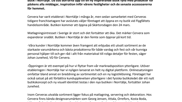 På skärtorsdagen öppnar Sveriges största butikskedja för kök och hem, Cervera, en ny butik i Norrtälje. Då slås dörrarna upp till en ny inspirerande butik fylld med produkter för påskens alla middagar, inspiration inför vårens festligheter och de senaste accessoarerna för hemmet.