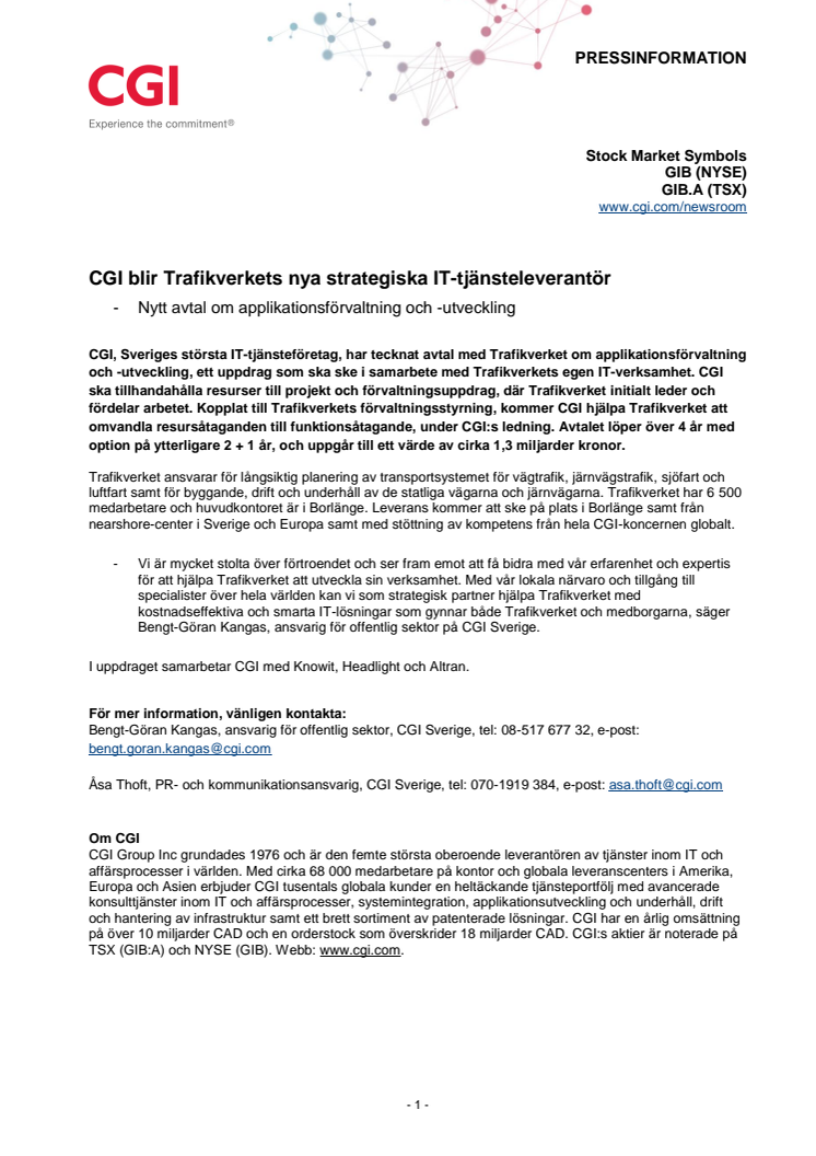CGI, Sveriges största IT-tjänsteföretag, har tecknat avtal med Trafikverket om applikationsförvaltning och -utveckling, ett uppdrag som ska ske i samarbete med Trafikverkets egen IT-verksamhet. Avtalet löper över 4 år med option på ytterligare 2 + 1 år, och uppgår till ett värde av cirka 1,3 miljarder kronor.