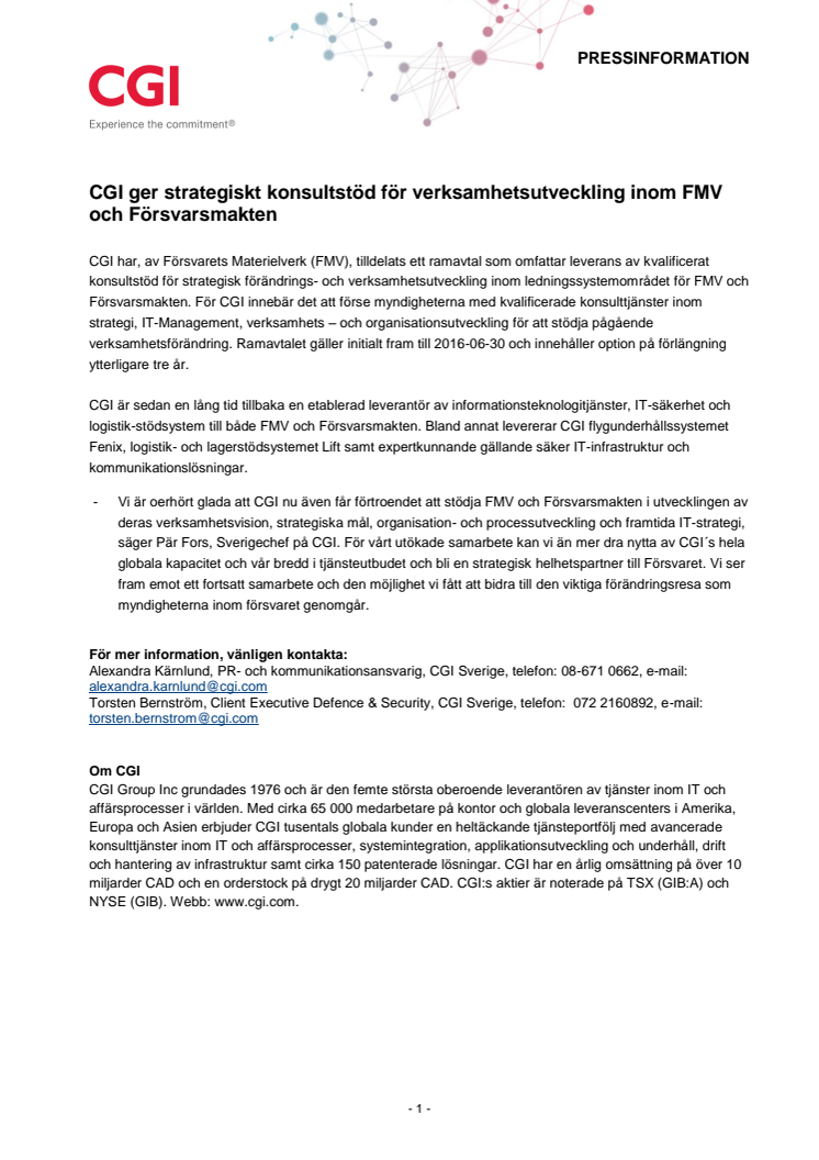 CGI har, av Försvarets Materielverk (FMV), tilldelats ett ramavtal som omfattar leverans av kvalificerat konsultstöd för strategisk förändrings- och verksamhetsutveckling inom ledningssystemområdet för FMV och Försvarsmakten. För CGI innebär det att förse myndigheterna med kvalificerade konsulttjänster inom strategi, IT-Management, verksamhets – och organisationsutveckling.