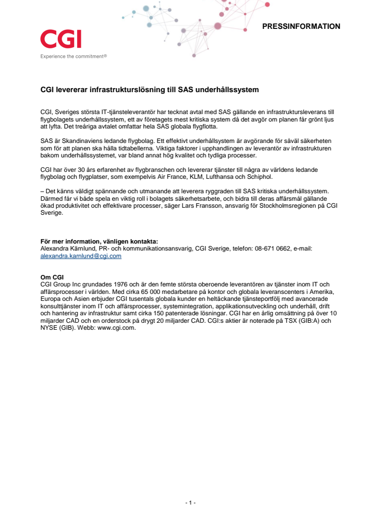 CGI hartecknat avtal med SAS gällande en infrastruktursleverans till flygbolagets underhållssystem, ett av företagets mest kritiska system då det avgör om planen får grönt ljus att lyfta. Det treåriga avtalet omfattar hela SAS globala flygflotta.