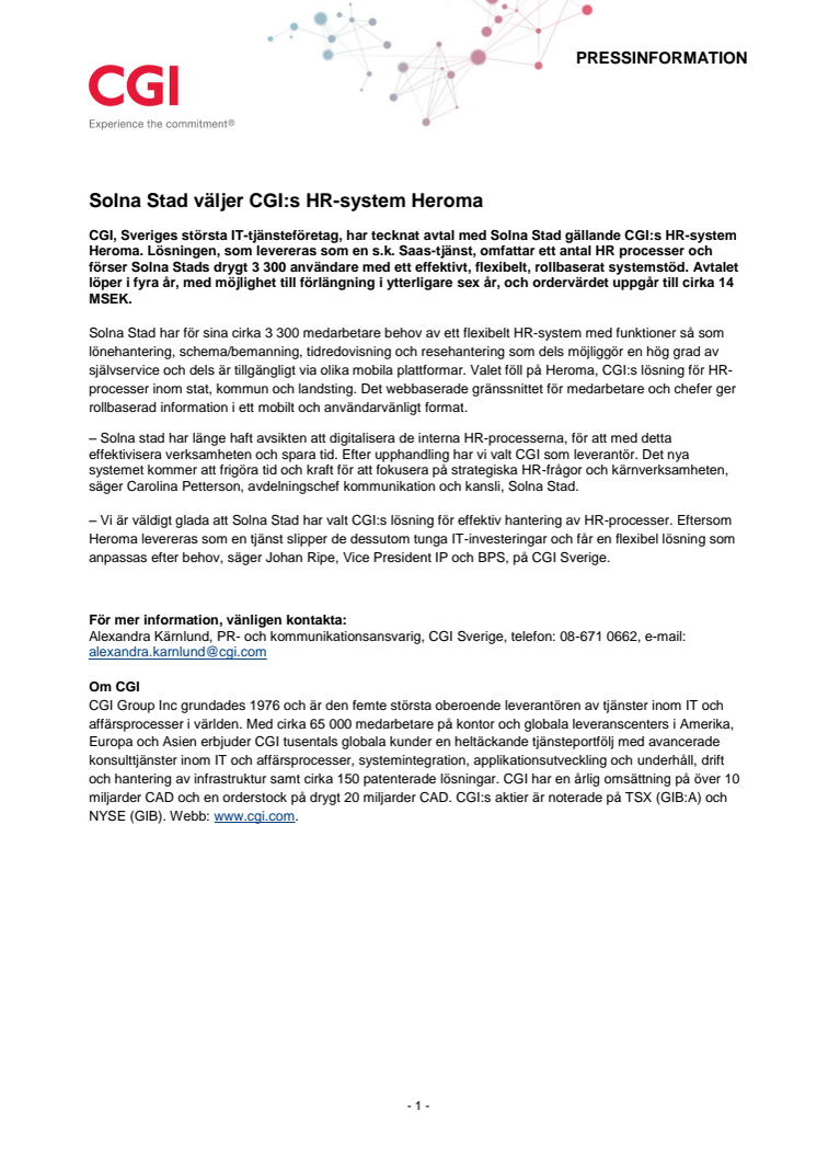 CGI har tecknat avtal med Solna Stad gällande CGI:s HR-system Heroma. Lösningen, som levereras som en s.k. Saas (Software as a service)-tjänst, omfattar ett antal HR processer och förser Solna Stads drygt 3 300 användare med ett effektivt, flexibelt, rollbaserat systemstöd. Avtalet löper i fyra år, med möjlighet till förlängning i ytterligare sex år, och ordervärdet uppgår till cirka 14 MSEK.