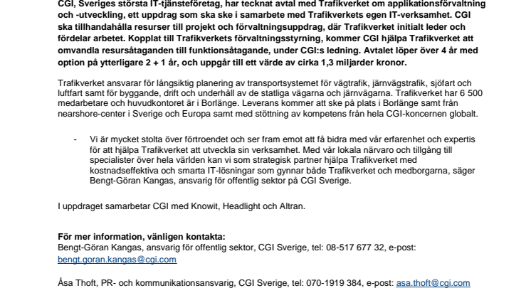 CGI, Sveriges största IT-tjänsteföretag, har tecknat avtal med Trafikverket om applikationsförvaltning och -utveckling, ett uppdrag som ska ske i samarbete med Trafikverkets egen IT-verksamhet. CGI ska tillhandahålla resurser till projekt och förvaltningsuppdrag, där Trafikverket initialt leder och fördelar arbetet. Kopplat till Trafikverkets förvaltningsstyrning, kommer CGI hjälpa Trafikverket att omvandla resursåtaganden till funktionsåtagande, under CGI:s ledning. Avtalet löper över 4 år med option på ytterligare 2 + 1 år, och uppgår till ett värde av cirka 1,3 miljarder kronor.
