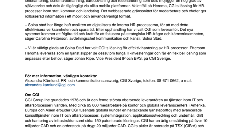 CGI, Sveriges största IT-tjänsteföretag, har tecknat avtal med Solna Stad gällande CGI:s HR-system Heroma. Lösningen, som levereras som en s.k. Saas-tjänst, omfattar ett antal HR processer och förser Solna Stads drygt 3 300 användare med ett effektivt, flexibelt och rollbaserat systemstöd. Avtalet löper i fyra år, med möjlighet till förlängning i ytterligare sex år, och ordervärdet uppgår till cirka 14 MSEK.