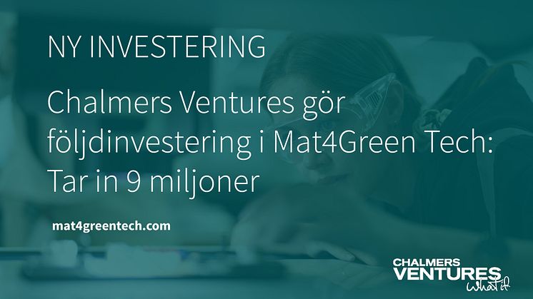 Chalmers Ventures portföljbolag Mat4Green Tech, ett forskningsföretag inom deep tech som är specialiserat på produkter och återvinning inom indium-tenn-oxid tar in 9 miljoner kronor. Bakom investeringen ligger Chalmers Ventures och Jovitech Invest med 3 miljoner vardera. Dessutom erhåller Mat4Green Tech 3 miljoner kronor från Energimyndigheten.