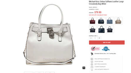 Forskarna hos Check Point Software hittade bland annat e-postmeddelanden som lockade mottagare till skadliga webbplatser med starkt rabatterade designprodukter som utgav sig för att vara Michael Kors. (de två bilderna nedan)