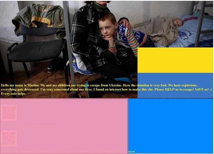 Check Point Softwares forskare hittade bland annat en annons som efterfrågade donationer till en påstådd ukrainare vid namn Marina. En kort beskrivning uppger att "Marina" och hennes barn försöker fly Ukraina på grund av den "mycket dåliga situationen" och ber om pengar, som ska doneras i kryptovaluta. QR-koden i annonsen går till en kryptoplånbok. En snabb sökning visar dock att huvudbilden på sajten är hämtad från en tidningsartikel från det tyska nyhetsorganet Deutsche Welle (DW). Ingen annan information verkar finnas, vilket väcker frågor om sidan verkligen är äkta och legitim.