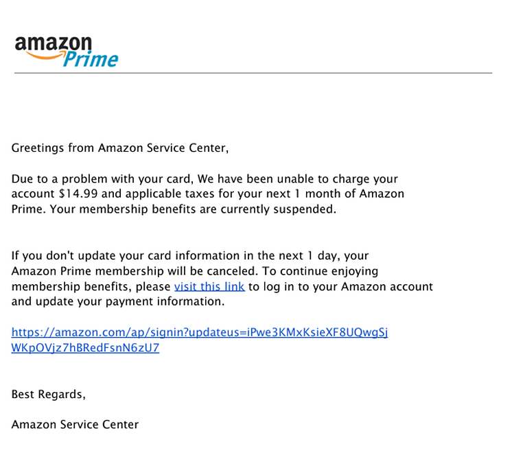 Check Point har även dokumenterat hur bedragare riktar sig mot enskilda användare via e-post och PDF-bilagor. Ett exempel är hur falska mejl som skickades till Amazon Prime-kunder med påståendet att deras betalning inte hade godkänts. Offren leddes vidare till en falsk inloggningssida där deras kontouppgifter stals. I en annan attack användes ett PDF-dokument med rubriken ”Amazon Prime Membership on Hold” för att lura mottagare att lämna ifrån sig kreditkortsinformation. Gemensamt för attackerna är att de skapar brådska och rädsla för att pressa användare att agera direkt.