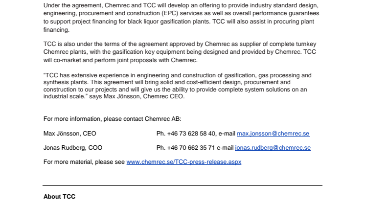 “TCC has extensive experience in engineering and construction of gasification, gas processing and synthesis plants. This agreement will bring solid and cost-efficient design, procurement and construction to our projects and will give us the ability to provide complete system solutions on an industrial scale.” says Max Jönsson, Chemrec CEO.