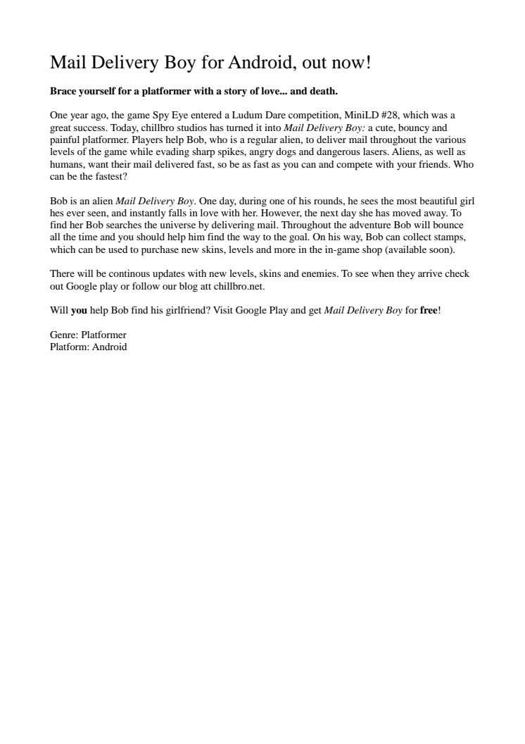Help Bob, who is a regular alien, to deliver mail throughout the various levels of the game while evading sharp spikes, angry dogs and dangerous lasers. Aliens, as well as humans, want their mail delivered fast, so be as fast as you can and compete with your friends. Who can be the fastest?
