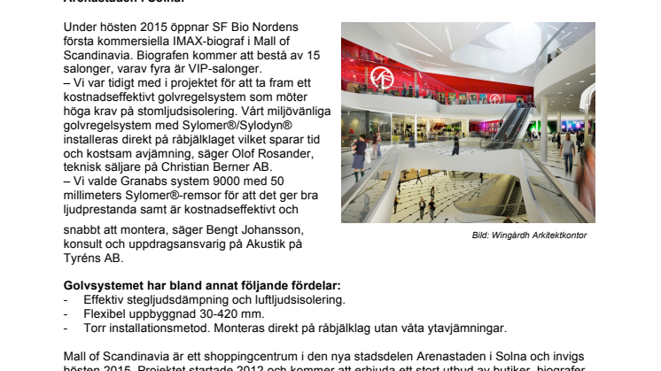 Christian Berner AB har fått uppdraget att leverera ett kostnadseffektivt och miljövänligt golvregelsystem med stomljudsisolering till Nordens första IMAX-biograf. Den nya SF-biografen kommer att byggas i Mall of Scandinavia i den nya stadsdelen Arenastaden i Solna.