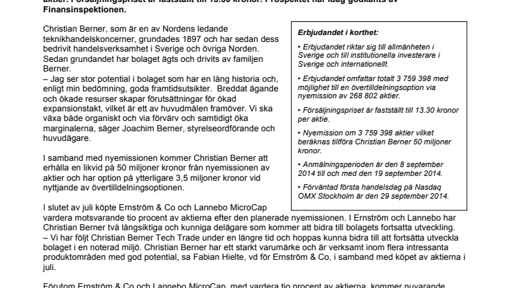 Som ett led i Christian Berner Tech Trade AB:s planerade notering på Nasdaq OMX First North, med första handelsdag den 29 september, genomförs nu en nyemission.