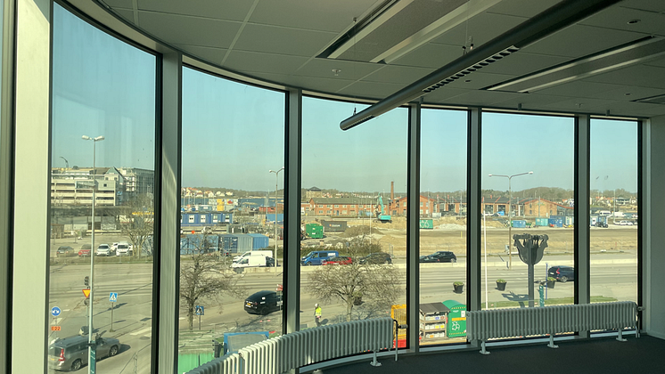 Insidan av Boverkets nya huvudkontor i Karlskrona, med böjt dynamiskt glas från ChromoGenics. Glaset reglerar ljusinsläpp i realtid och skapar en behaglig inomhusmiljö.