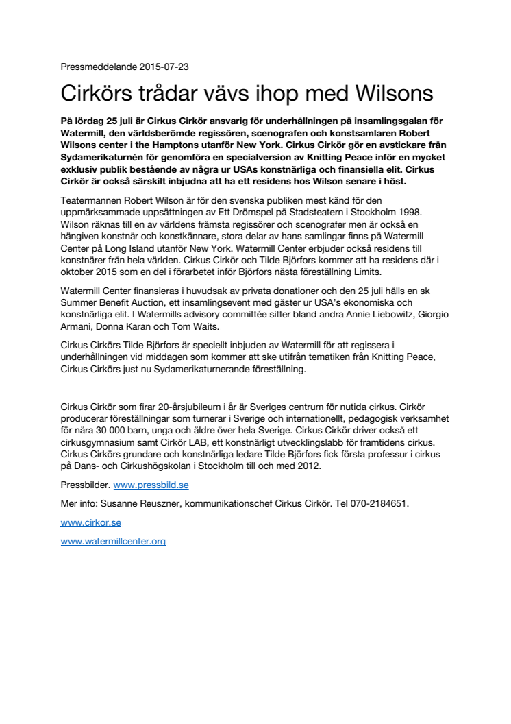 På lördag 25 juli medverkar Cirkus Cirkör vid insamlingsgalan för Watermill, den världsberömde regissören, scenografen och konstsamlaren Robert Wilsons center i the Hamptons utanför New York. Cirkus Cirkör gör en avstickare från Sydamerikaturnén för en specialversion av Knitting Peace inför en mycket exklusiv publik bestående av några ur USAs konstnärliga och finansiella elit.