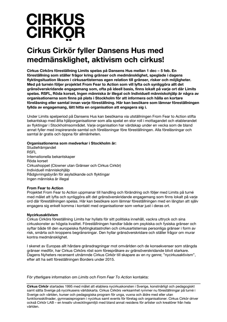 Limits spelas på Dansens Hus mellan 1 dec – 5 feb. En föreställning som ställer frågor kring gränser och medmänsklighet, speglade i dagens flyktingsituation. Under Limits spelperiod på Dansens Hus kan besökarna via utställningen From Fear to Action stifta bekantskap med åtta hjälporganisationer som alla spelat en stor roll i mottagandet och etablerandet av flyktingar i Stockholmsområdet.