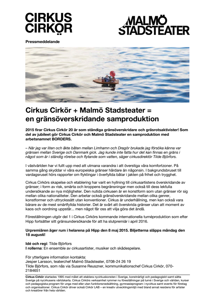 2015 firar Cirkus Cirkör 20 år som ständiga gränsöverskridare och gräsrotsaktivister! Som del av jubileet gör Cirkus Cirkör och Malmö Stadsteater en samproduktion med arbetsnamnet BORDERS. Cirkus CirkörsTilde Björfors regisserar och ensemblen består av cirkusartister, skådespelare och musiker.