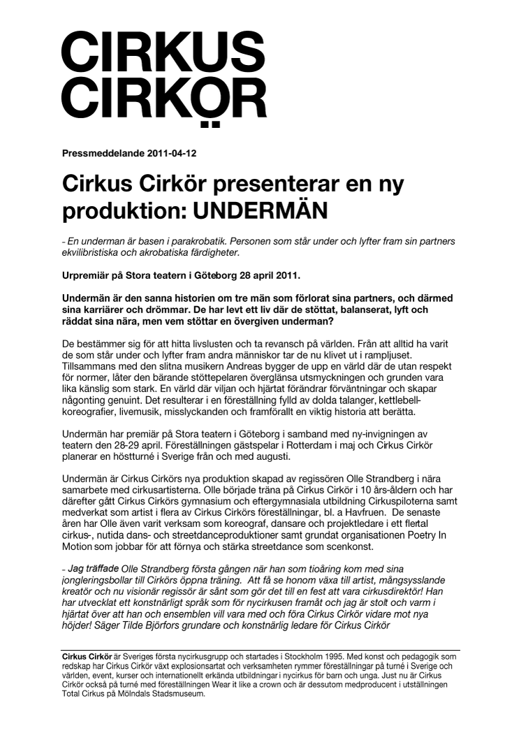 Cirkus Cirkör presenterar en ny produktion: UNDERMÄN