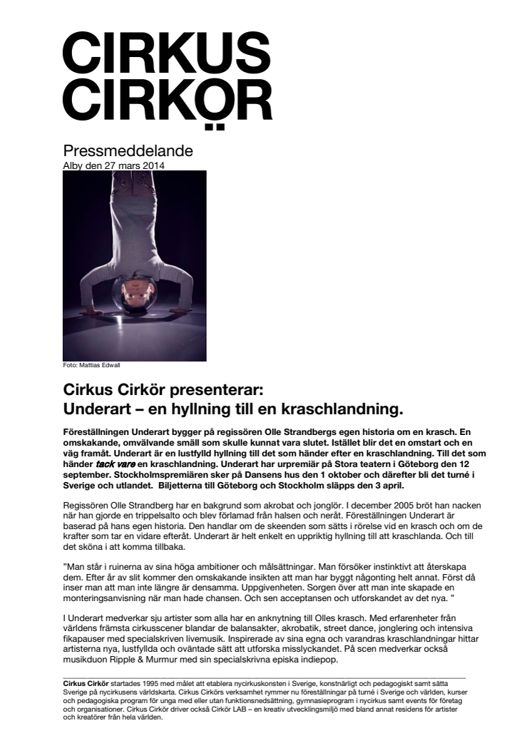 Föreställningen bygger på regissören Olle Strandbergs egen historia om en krasch. En omskakande, omvälvande smäll som skulle kunnat vara slutet. Istället blir det en omstart och en väg framåt. Nycirkusföreställningen Underart har premiär i Göteborg den 12/9 och Stockholmspremiär på Dansens hus den 1/10, sedan startar turné.