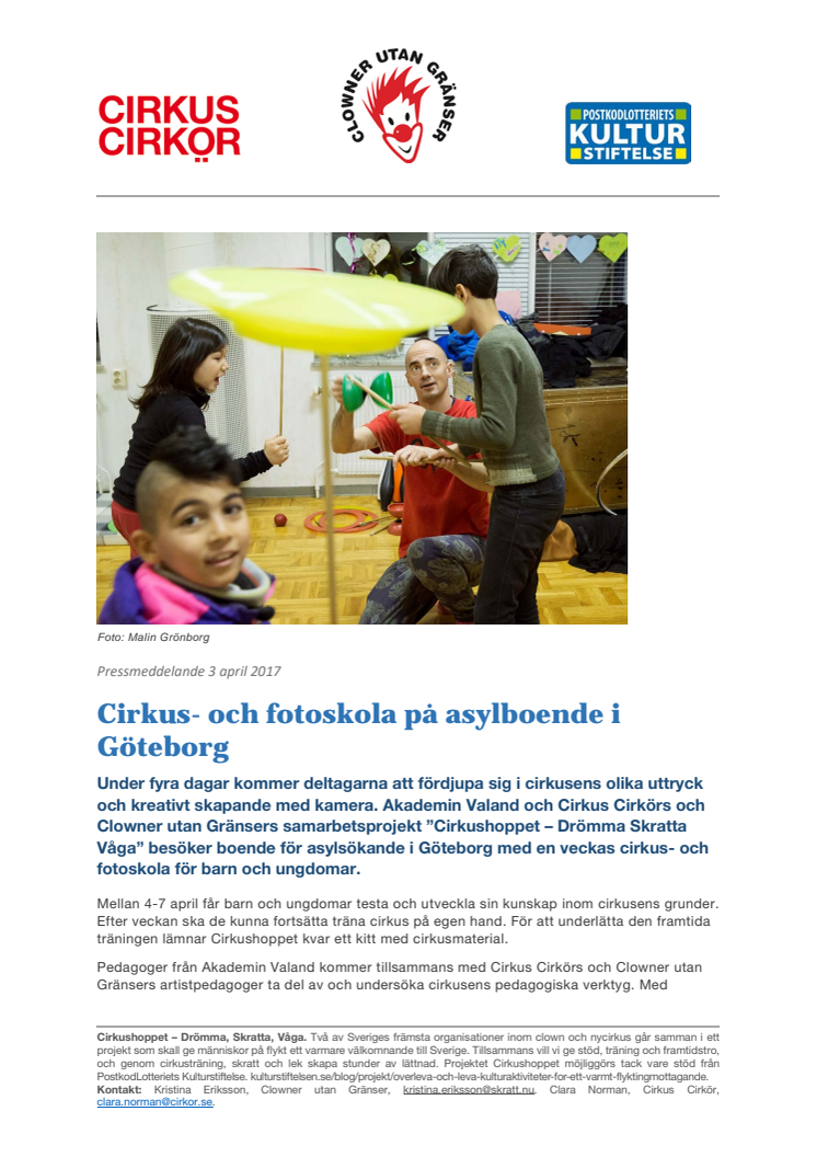 Under fyra dagar kommer deltagarna att fördjupa sig i cirkusens olika uttryck och kreativt skapande med kamera. Akademin Valand och Cirkus Cirkörs och Clowner utan Gränsers samarbetsprojekt ”Cirkushoppet – Drömma Skratta Våga” besöker boende för asylsökande i Göteborg med en veckas cirkus- och fotoskola för barn och ungdomar.