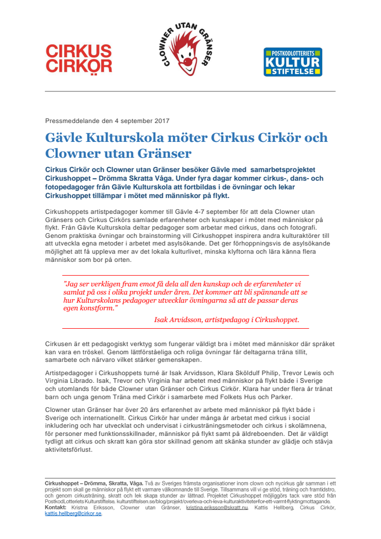 Cirkus Cirkör och Clowner utan Gränser besöker Gävle med samarbetsprojektet Cirkushoppet – Drömma Skratta Våga. Under fyra dagar kommer cirkus-, dans- och fotopedagoger från Gävle Kulturskola att fortbildas i de övningar och lekar Cirkushoppet tillämpar i mötet med människor på flykt.