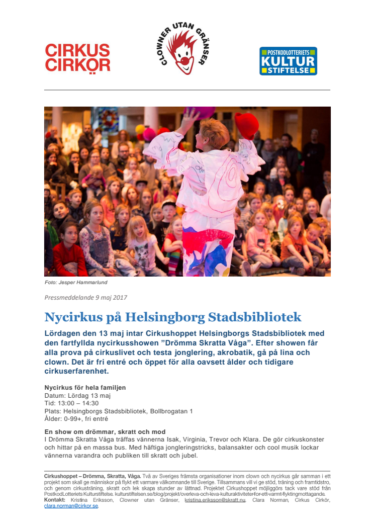 Lördagen den 13 maj intar Cirkushoppet Helsingborgs Stadsbibliotek med den fartfyllda nycirkusshowen ”Drömma Skratta Våga”. Efter showen får alla prova på cirkuslivet och testa jonglering, akrobatik, gå på lina och clown. Det är fri entré och öppet för alla oavsett ålder och tidigare cirkuserfarenhet.
