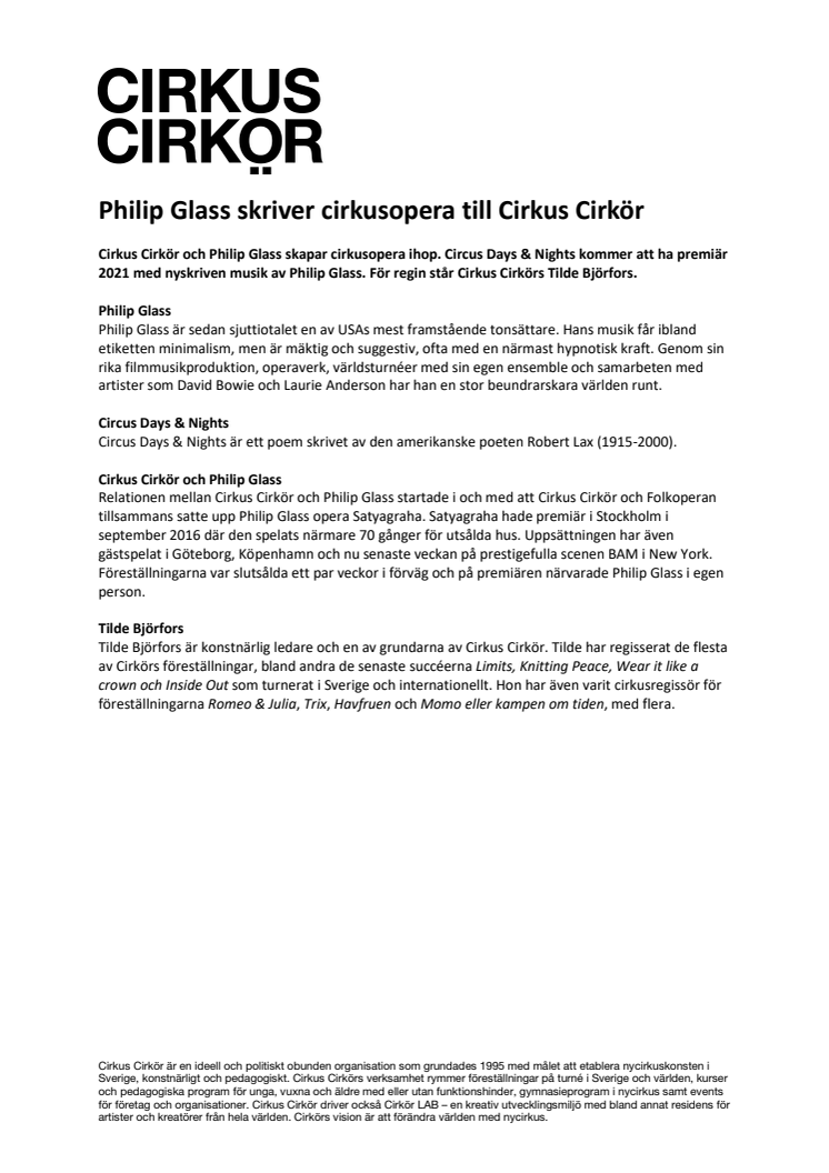 Cirkus Cirkör och Philip Glass skapar cirkusopera ihop. Circus Days & Nights kommer att ha premiär 2021 med nyskriven musik av Philip Glass. För regin står Cirkus Cirkörs Tilde Björfors.
