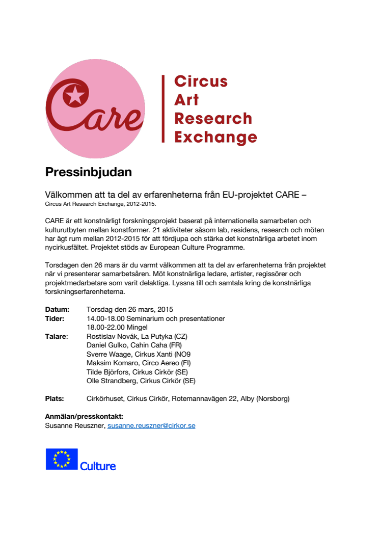 Den 26 mars presenteras erfarenheterna av EU-projektet CARE i samband med ett seminarium hos Cirkus Cirkör. CARE står för Circus Art Research Exchange och är ett konstnärligt forskningsprojekt som syftar till att fördjupa och stärka det konstnärliga arbetet inom nycirkusområdet. CARE baseras på internationella samarbeten och kulturutbyten mellan konstformer. Stöds av European Culture Programme.