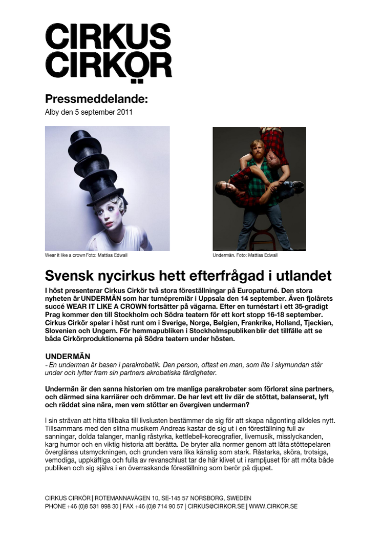 Cirkus Cirkör presenterar två föreställningar på Europaturné. Nya föreställningen Undermän börjar i Uppsala den 14/9. Även Wear it like a crown fortsätter på vägarna. Efter en turnéstart i Prag kommer den till Stockholm 16-18/9. Under hösten turnerar CIrkus Cirkör med båda föreställningarna i Sverige, Norge, Belgien, Frankrike, Holland, Tjeckien, Slovenien och Ungern.