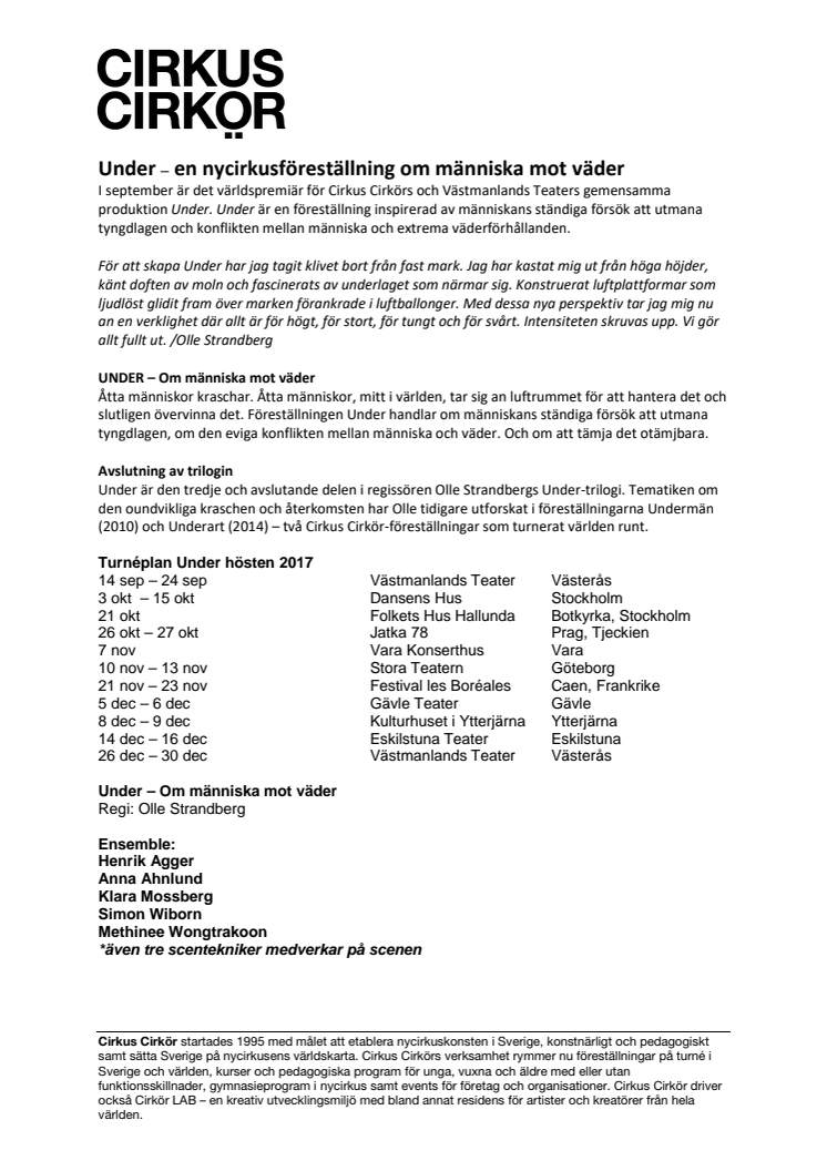 I september är det världspremiär för Cirkus Cirkörs och Västmanlands Teaters gemensamma produktion Under. Under är en föreställning inspirerad av människans ständiga försök att utmana tyngdlagen och konflikten mellan människa och extrema väderförhållanden.