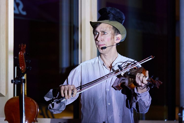 Samuel "Looptook" Andersson spelar vid site specificföreställning av Knitting Peace vid de nordiska ambassaderna i Berlin 2023, i samband med Sveriges ordförandeskap i EU.