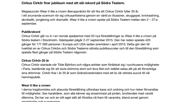 Cirkus Cirkör går nu in i en nionde spelperiod med 20 nya föreställningar av Wear it like a crown på Södra teatern i Stockholm. Gästspelet pågår 2-27 september 2015. Den har redan spelats 420 gånger för 177 000 personer i Europa och USA sedan premiären i april 2010. Detta gör den till tveklöst en av Cirkus Cirkörs och Södra Teaterns största publiksuccéer och till den föreställning som spelats flest gånger på Södra Teatern någonsin.