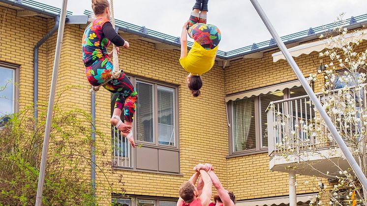 Det började med en mindre föreställning på vård- och omsorgsboendet Alby Äng i slutet av april. Initiativet kom från cirkusartisterna, nu när deras föreställningar på teatrar och skolor blivit inställda så ville de gärna göra en om en show för de äldre. En corona-säker show. Sittande i sina fönster kunde de boende, på ett säkert sätt, uppleva en rolig och fartfylld show späckad med akrobatik, humor och medryckande musik när cirkusartisterna uppträdde på boendets innergård. För artisterna blev det ett efterlängtat möte med publik igen. För vården och omsorgen väckte föreställningen mersmak och nu får fler verksamheter möjlighet att uppleva den. Turnén passerar både vård- och omsorgsboenden och boenden inom funktionsnedsättningsomsorgen.