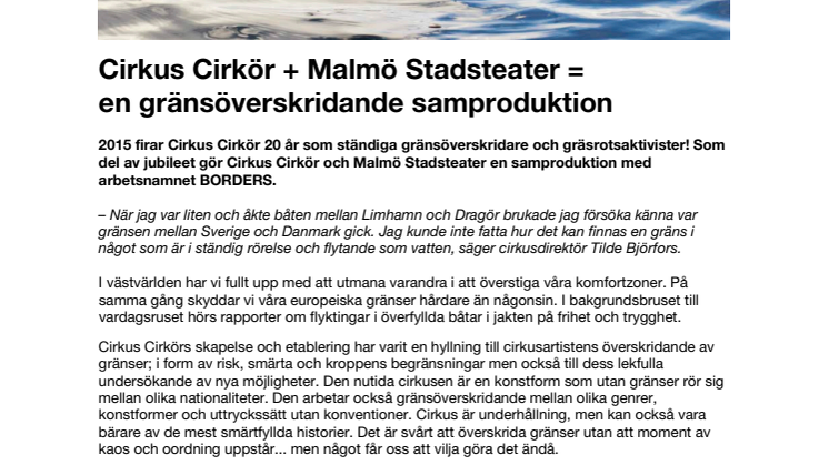 2015 firar Cirkus Cirkör 20 år som ständiga gränsöverskridare och gräsrotsaktivister! Som del av jubileet gör Cirkus Cirkör och Malmö Stadsteater en samproduktion med arbetsnamnet BORDERS.