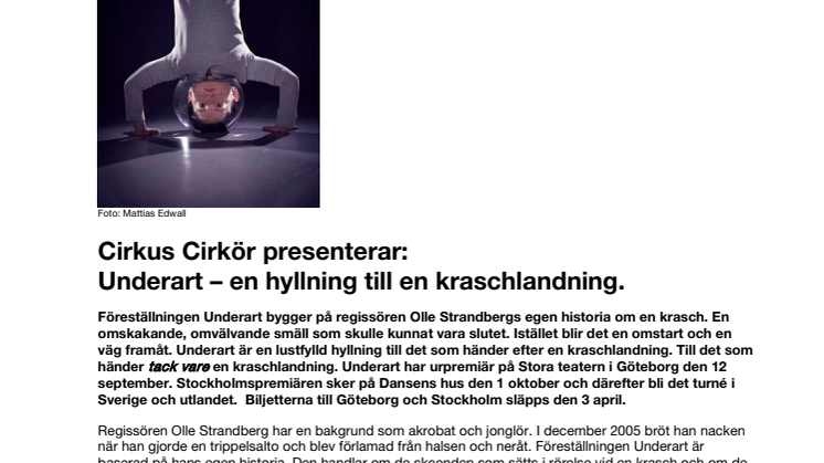 Föreställningen Underart bygger på regissören Olle Strandbergs egen historia om en krasch. En omskakande, omvälvande smäll som skulle kunnat vara slutet. Istället blir det en omstart och en väg framåt. Underart är en lustfylld hyllning till det som händer efter en kraschlandning. Till det som händer tack vare en kraschlandning. Underart har urpremiär på Stora Teatern i Göteborg den 12 september. Stockholmspremiären sker på Dansens hus den 1 oktober och därefter bli det turné i Sverige och utlandet. Biljetterna till Göteborg, Stockholm och Falun släpps den 3 april.
