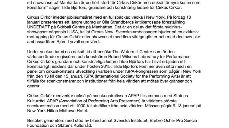 Kommande vecka åker 20-årsjubilerande Cirkus Cirkör till New York för en mängd olika aktiviteter. Föreställningen Underart spelas på det första nycirkus-showcaset någonsin i USA kallat Circus Now, Tilde Björfors deltar i en paneldebatt på ISPA-kongressen och samtidigt planeras för ett residens på Robert Wilsons the Watermill Center. Cirkus Cirkör medverkar även på världens största scenkonstmässa APAP som en del av Statens kulturråds satsning på att visa upp svensk scenkonst i USA.