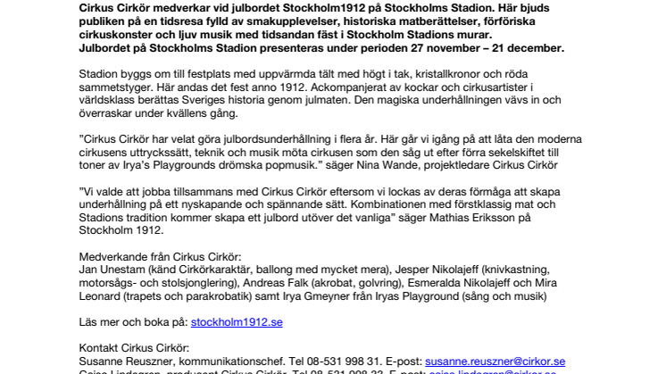 Cirkus Cirkör medverkar vid julbordet Stockholm1912 på Stockholms Stadion. Här bjuds publiken på entidsresa fylld av smakupplevelser, historiska matberättelser, förföriska cirkuskonster och ljuv musik med tidsandan fäst i Stockholm Stadions murar.