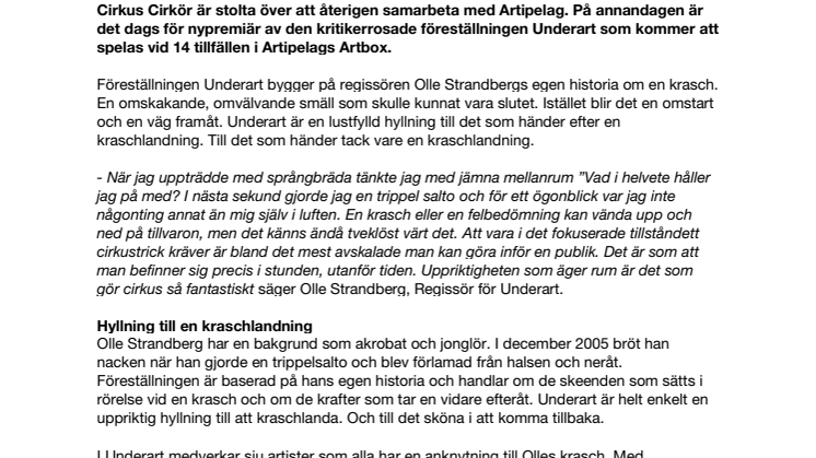Cirkus Cirkör är stolta över att återigen samarbeta med Artipelag. På annandagen är det dags för nypremiär av den kritikerrosade föreställningen Underart som kommer att spelas vid 14 tillfällen i Artipelags Artbox.