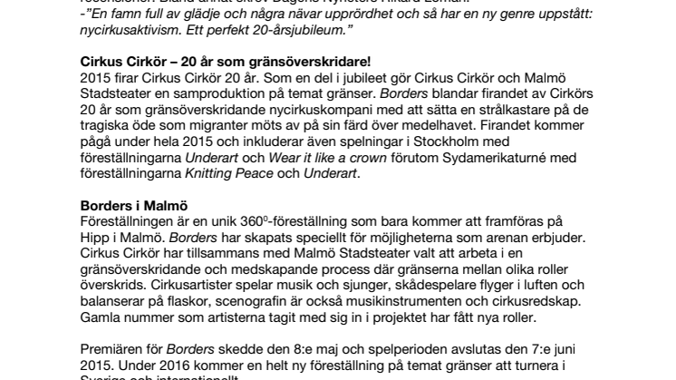 2015 firar Cirkus Cirkör 20 år. Som en del i jubileet gör Cirkus Cirkör och Malmö Stadsteater en samproduktion på temat gränser. Borders blandar firandet av Cirkörs 20 år som gränsöverskridande nycirkuskompani med att sätta en strålkastare på de tragiska öde som migranter möts av på sin färd över medelhavet. Firandet kommer pågå under hela 2015 och inkluderar även spelningar i Stockholm med föreställningarna Underart och Wear it like a crown förutom Sydamerikaturné med föreställningarna Knitting Peace och Underart.