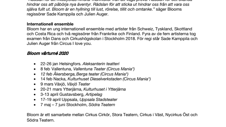 Bloom är ett samarbete mellan Cirkus Cirkör, Stora Teatern, Cirkus i Väst, Nycirkus Öst och Södra Teatern.