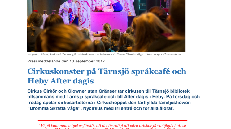 Cirkus Cirkör och Clowner utan Gränser tar cirkusen till Tärnsjö bibliotek tillsammans med Tärnsjö språkcafé och till After dagis i Heby. På torsdag och fredag spelar cirkusartisterna i Cirkushoppet den fartfyllda familjeshowen ”Drömma Skratta Våga”. Nycirkus med fri entré och för alla åldrar.